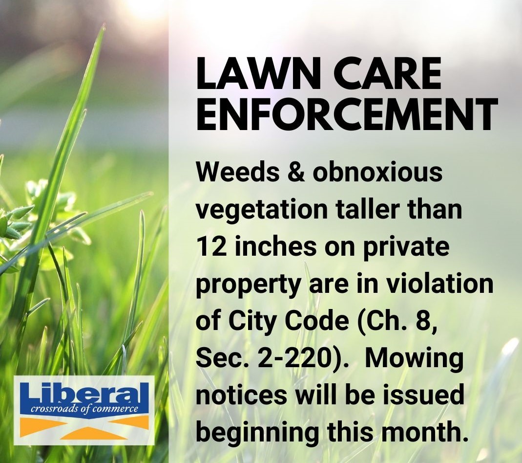 Weeds and obnoxious vegetation taller than 12 inches on private property are in violation of City Code (Ch. 8, Sec. 2-220). Beginning April 1, 2024, Code Enforcement staff will issue notices for properties that are in violation of this ordinance. Upon delivery of a notice, property owners have five (5) days to mow their property, including lawns, alleyways, and easements. Failure to do so will result in the City mowing and assessing a minimum $150.00 charge to the property owner. For questions about this ordinance, please call (620) 626-2261.
