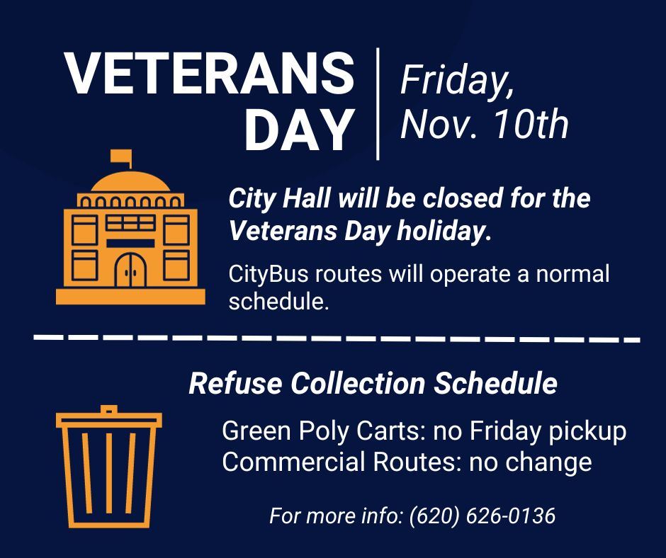 City Hall will be closed Friday, Nov. 10th in observance of Veterans Day.