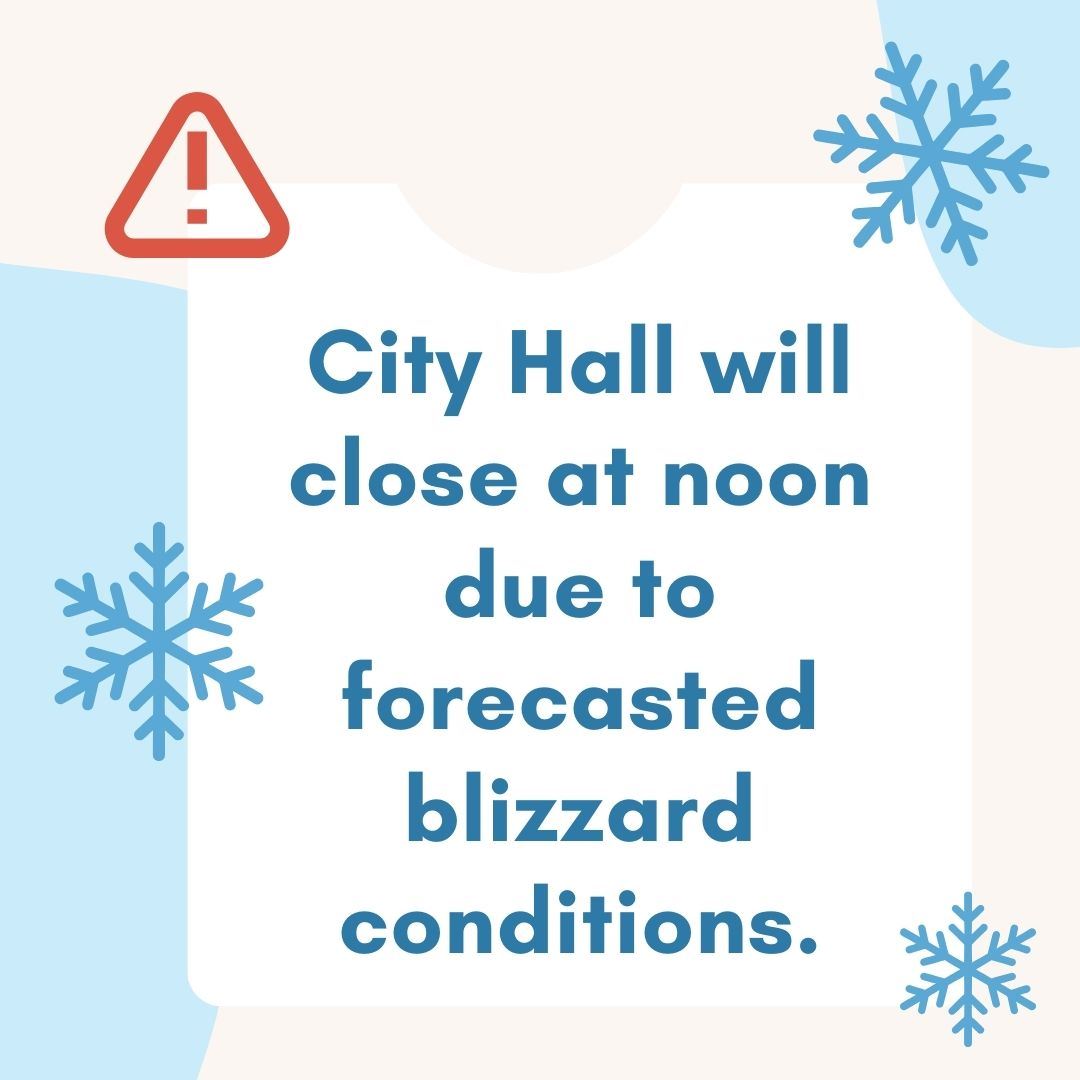 City Hall will close at noon today due to forecasted weather conditions. Stay safe - follow weather advisories and avoid outdoor activities & travel.